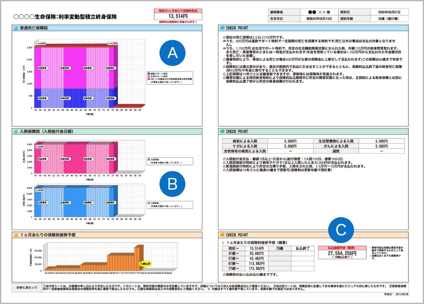 加入している生命保険証券を1枚の「証券分析シート」にまとめ、保険のプロが解説します。保障内容をグラフで表示し、「なにが」「いつまで」「いくら」ついているのかがスッキリわかりやすく。保障とともに、保険料がどう変わるかもご覧いただけます。